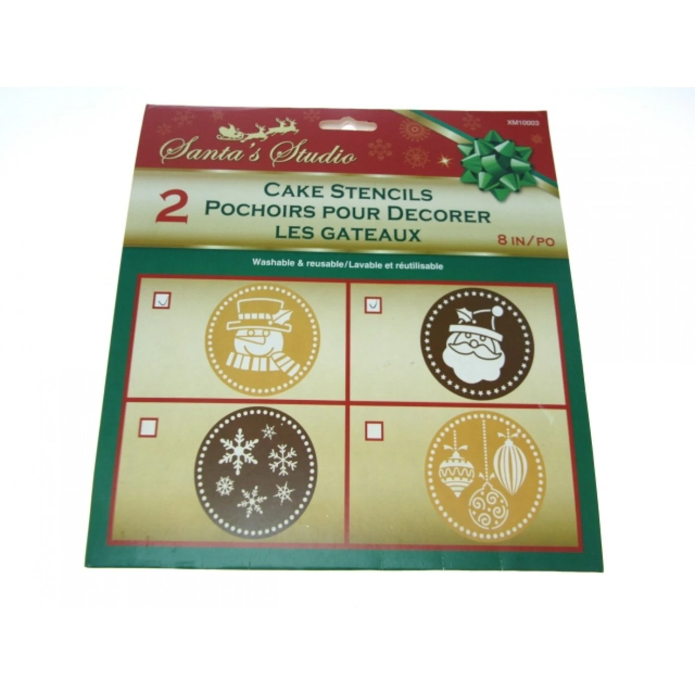 Pack contains 2 cake stencils made from plastic and featuring a Santa design and a snowman design. Each stencil measures approximately 21 cm in diameter.