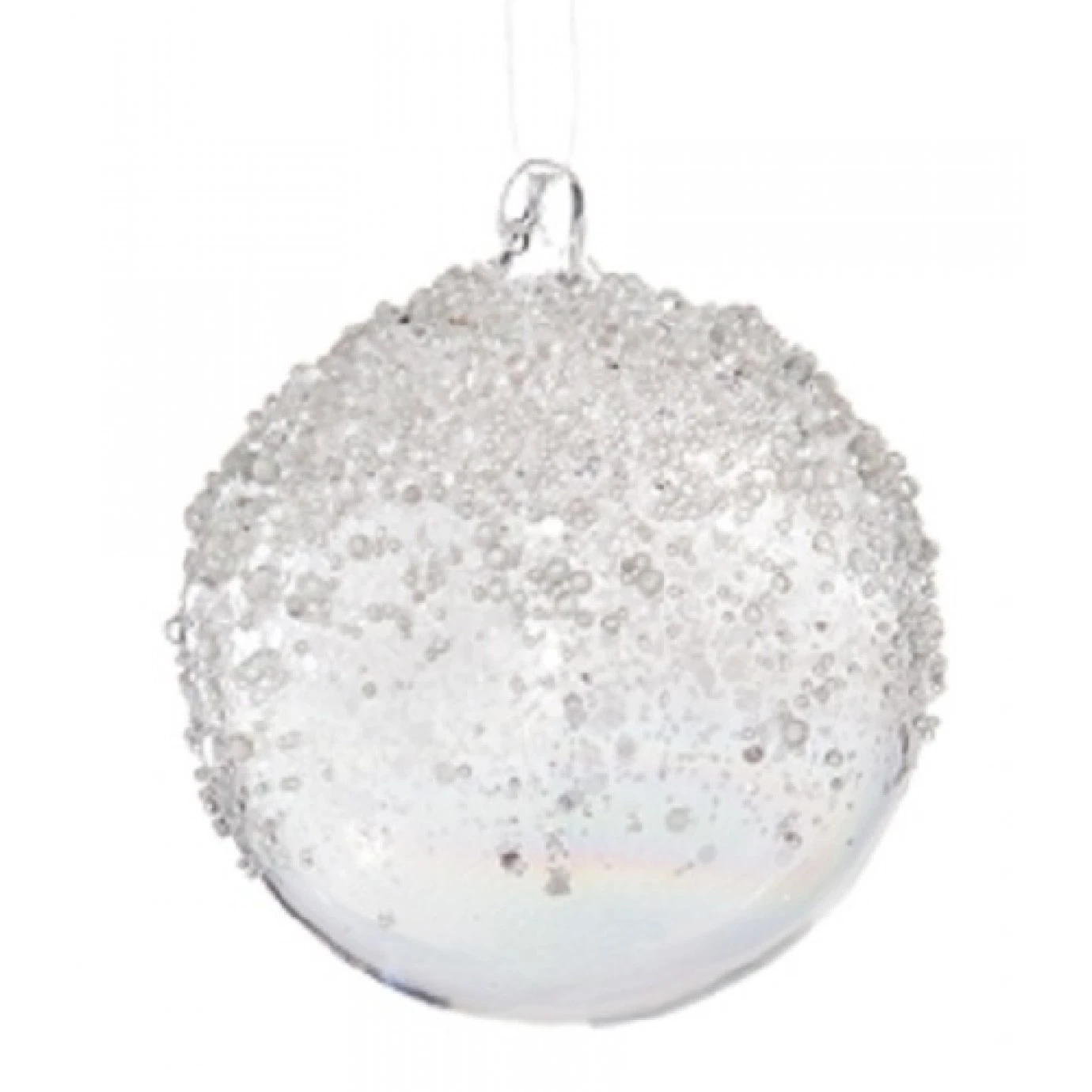 One glass bauble with clear finish and silver glitter. Also features attached fishing line hanger.