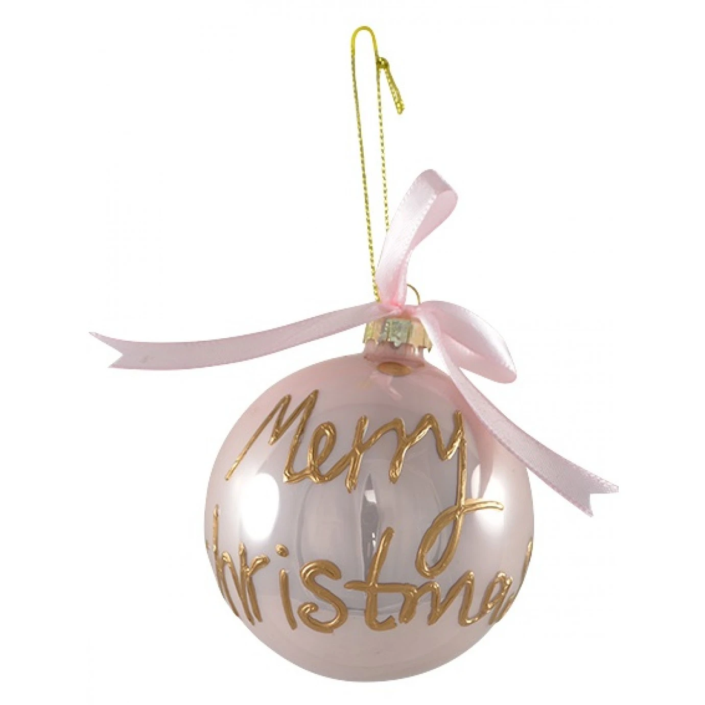 One glass bauble with gloss finish and gold painted lettering that reads ‘Merry Christmas’. Also features pink ribbon bow attached at the top plus gold twine hanger.