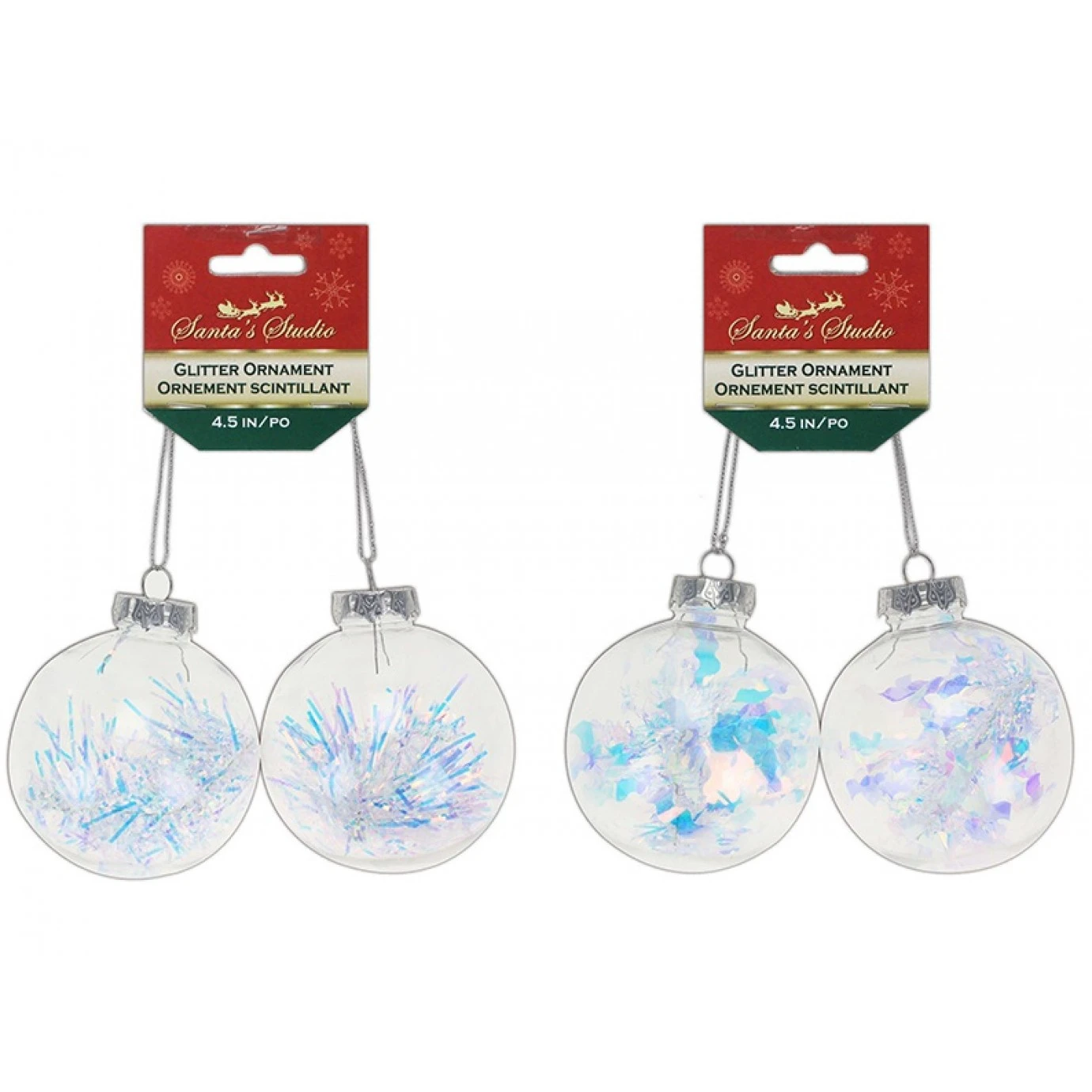 Pack contains two hanging bauble decorations made from plastic with attached cord and tinsel decoration inside.