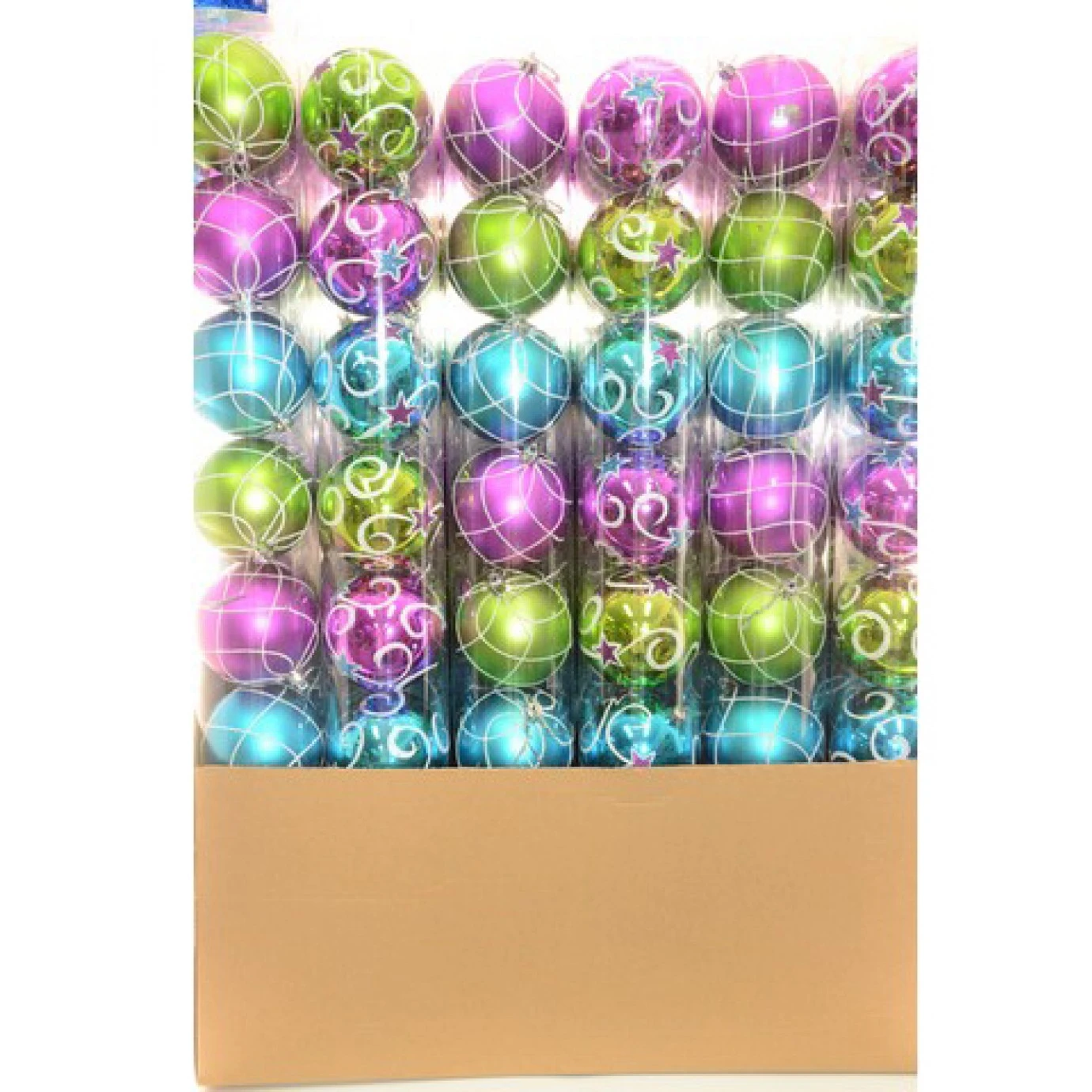 Each pack contains 8 plastic baubles in a mix of magenta, blue, and green with assorted glitter patterns and designs. Available in assorted designs, we are unable to offer a design preference for this item, you will be supplied with an assortment from the available design(s). Each bauble measures approximately 7.5 cm in diameter and come with an attached cord for hanging. Made form plastic with glitter painted design.