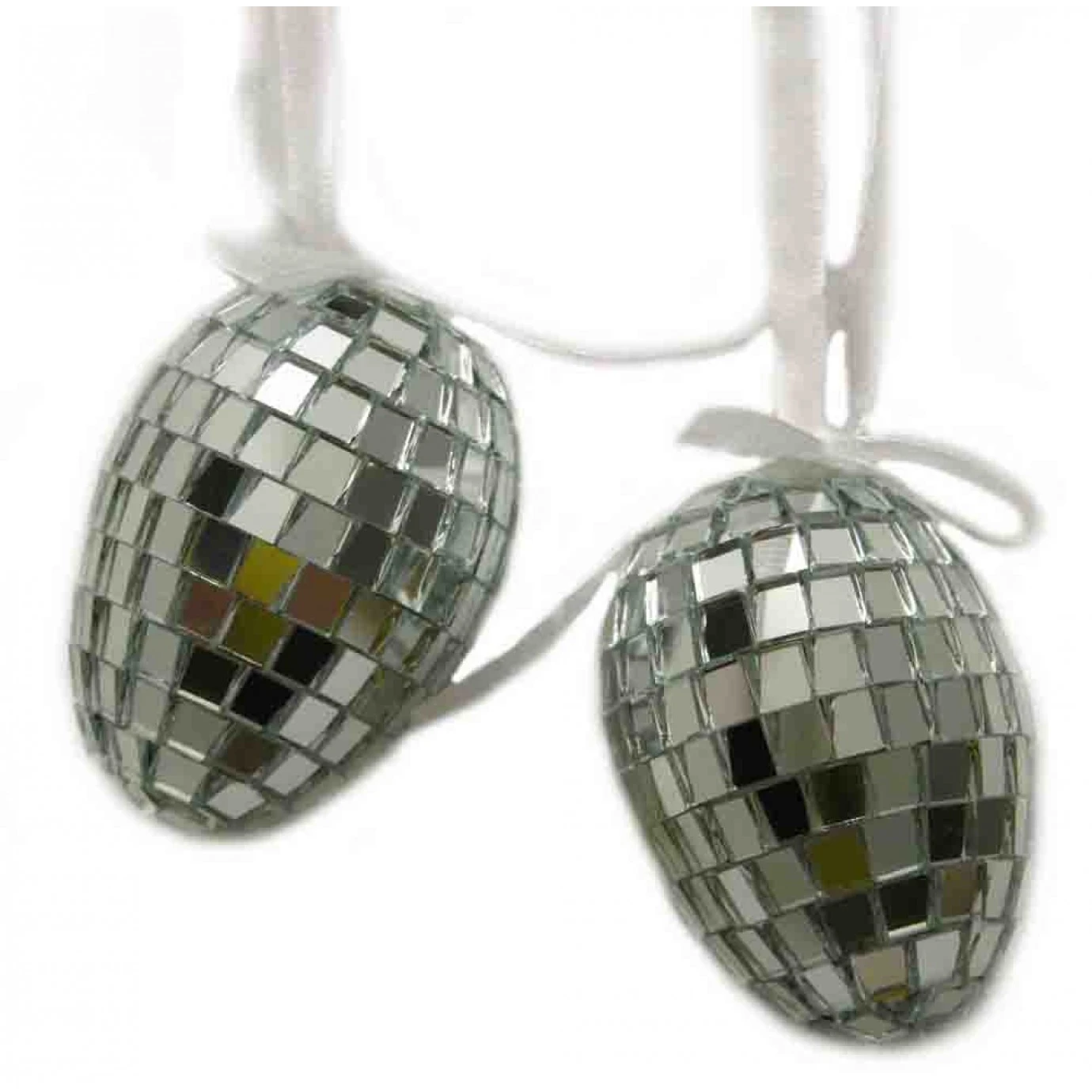 A set of two disco eggs made from a foam core with reflective coating much like a mirror ball. Each egg is attached to a piece of white ribbon.