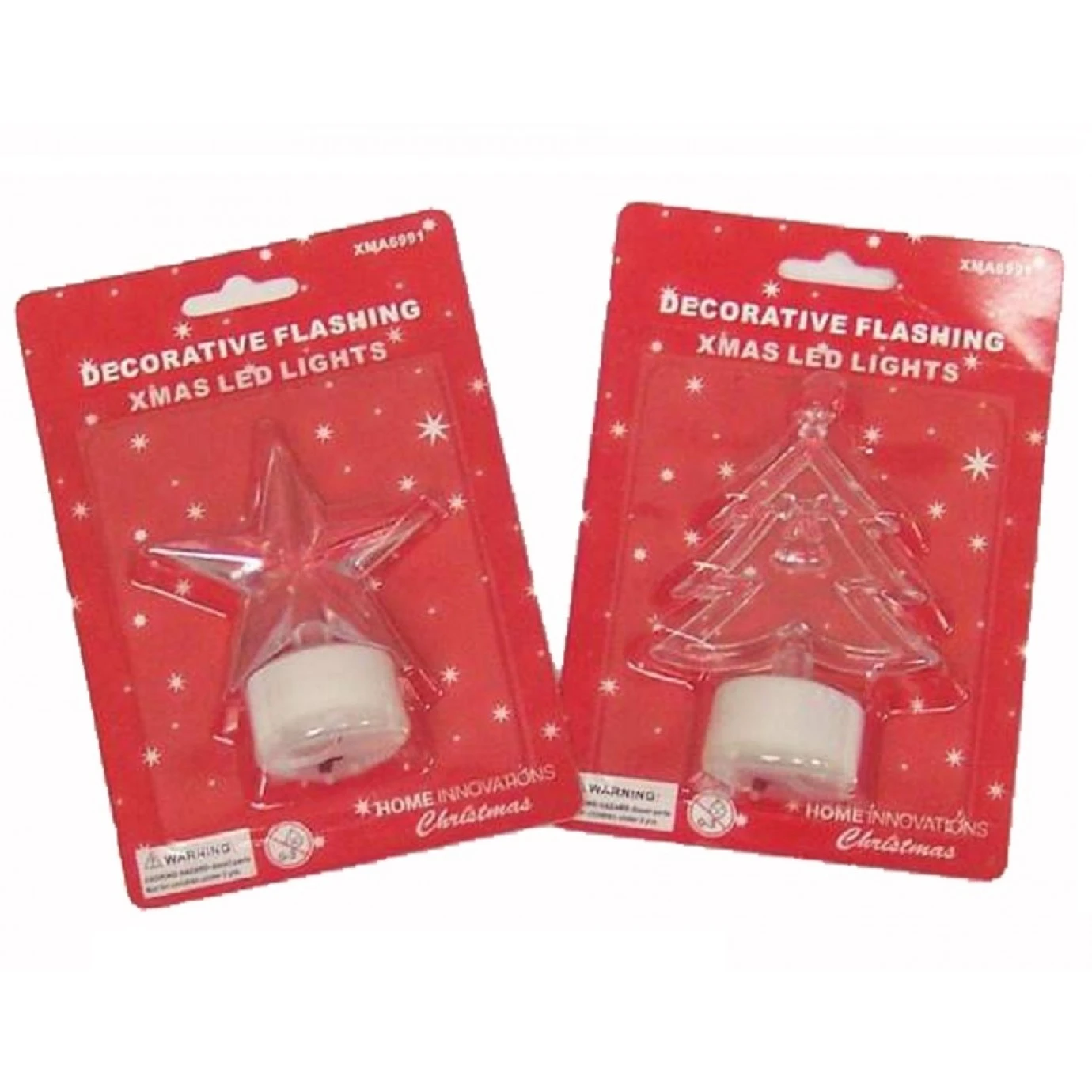 Available in two designs: Star and Christmas Tree. Batteries included. Light slowly strobes between red, blue, green and purple. Ornaments stand approximately 10 cm tall.