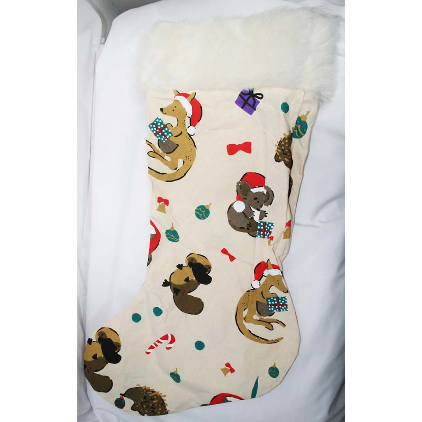 Stocking is made from calico with printed design on both sides, faux fur trim and ribbon hanger.