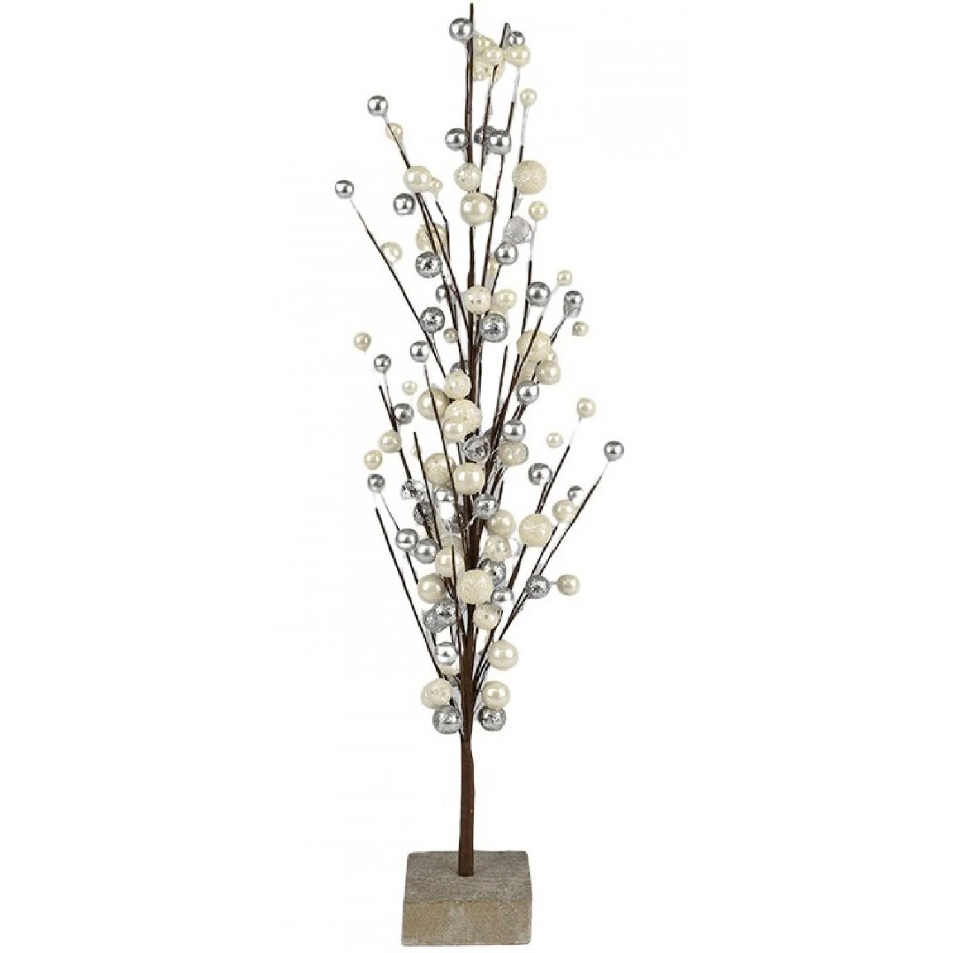 Decorative tree is made with a wooden base and wire core stem/limbs with attached foam and plastic beads.