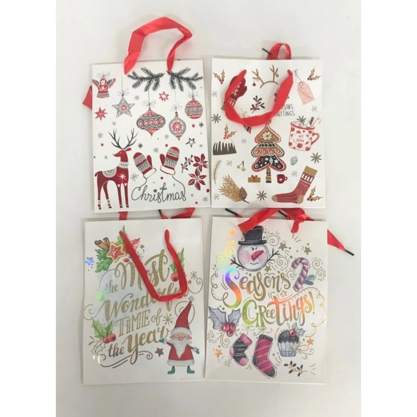 Gift bag is made from wax paper with ribbon drawstring at the top. Available in assorted designs, please note we are unable to offer a design preference. You are purchasing one individual gift bag.
