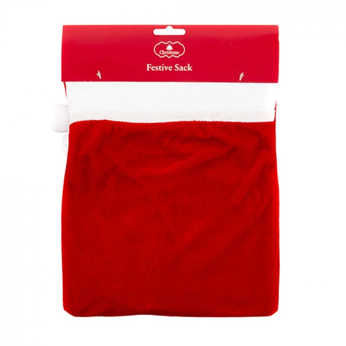 Gift sack is made from synthetic velvet with braided gold polyester drawstrings.