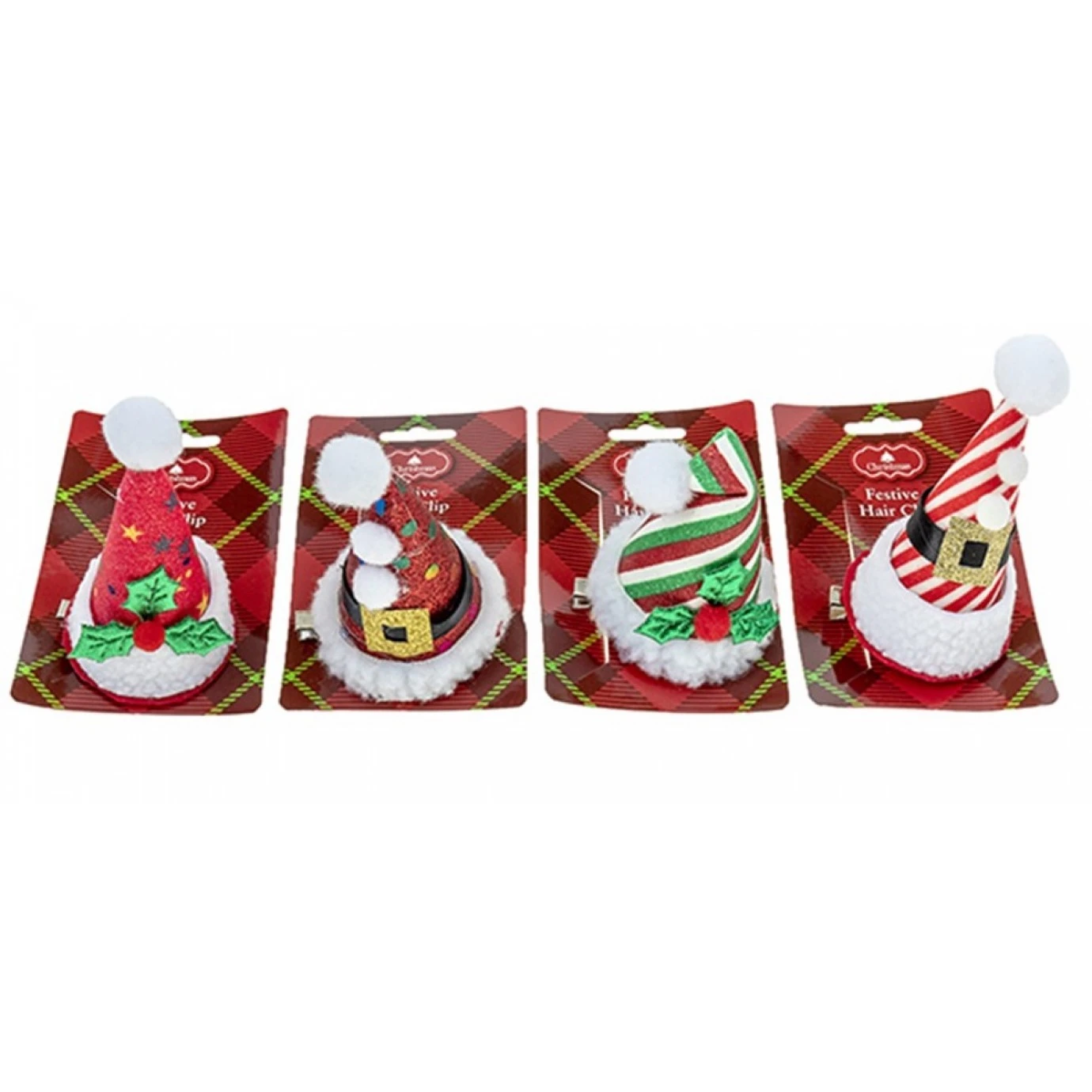 Metal hair clip with attached polyester hat featuring glitter decoration. Hat measures approximately 12 cm tall.