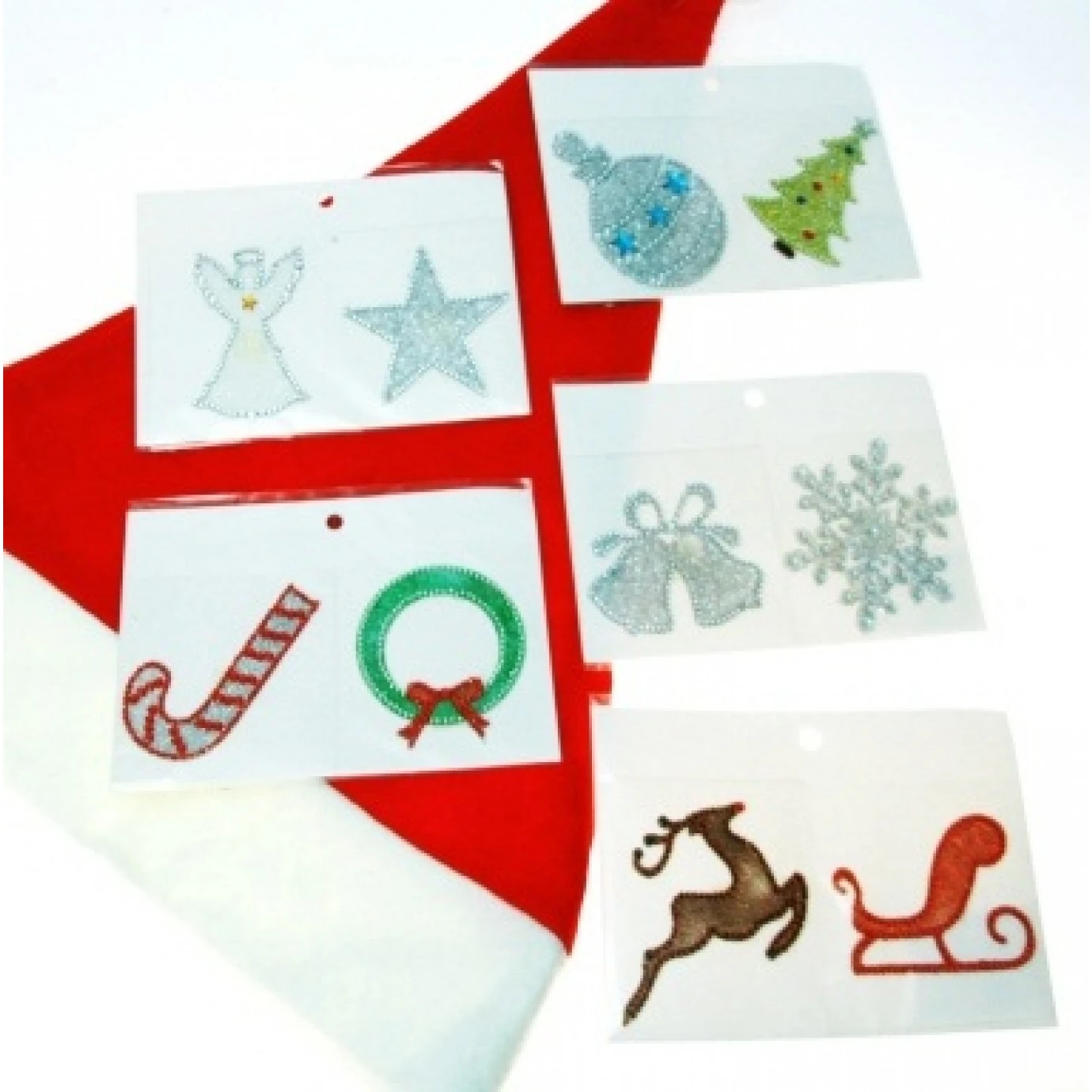 Available in the following designs: Sleigh and reindeer, Christmas tree and bauble, snowflake and bells, wreath and candy cane, and angel and star.