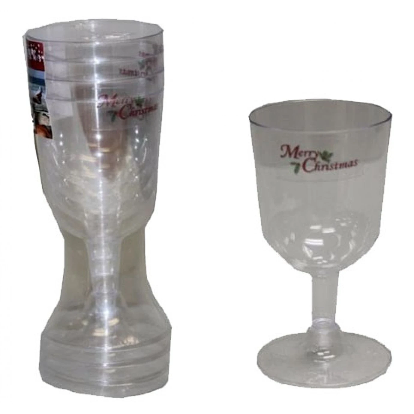 Pack contains four plastic wine glasses featuring the lettering ‘Merry Christmas’ near the top. Glasses come with separate bases. Each glass measures approximately 12 cm tall and 6.5 cm in diameter.